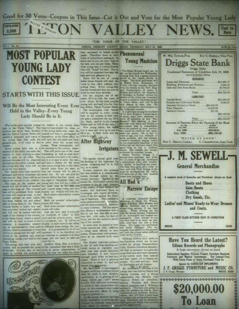 On April 15, 1909, James F. Blumer tightened the quoins, locked the chase, rolled on the ink, pulled the large lever, and printed Volume 1, Number 1 of the Teton Valley News.