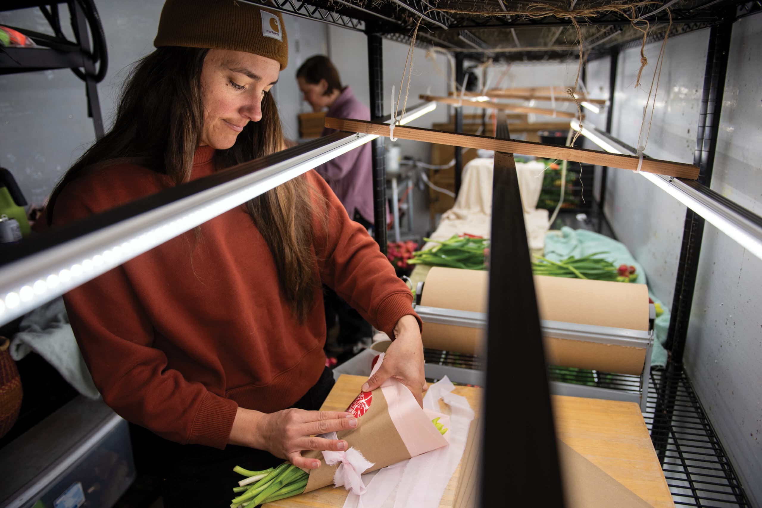 In 2022, Red House offered their second spring tulip share in March and April, this time with blooms grown hydroponically under LED lights. Knowing they were onto something, they pushed the bloom schedule even earlier the next year to offer their first Valentine’s bouquets at valley coffee shops. In 2024 they added a Valentine’s bouquet preorder option to their online store. By fall 2024, Emily and Katie felt ready to commit to a larger scale of forced tulip cultivation. Armed with new experience, they placed an order for 10,000 tulip bulbs.