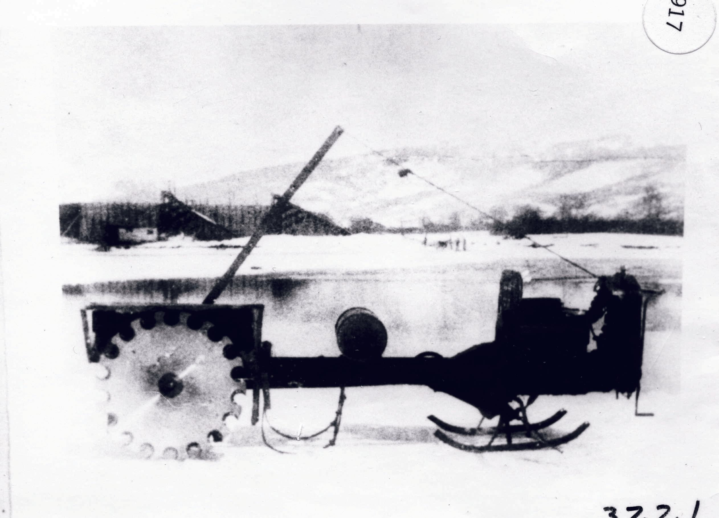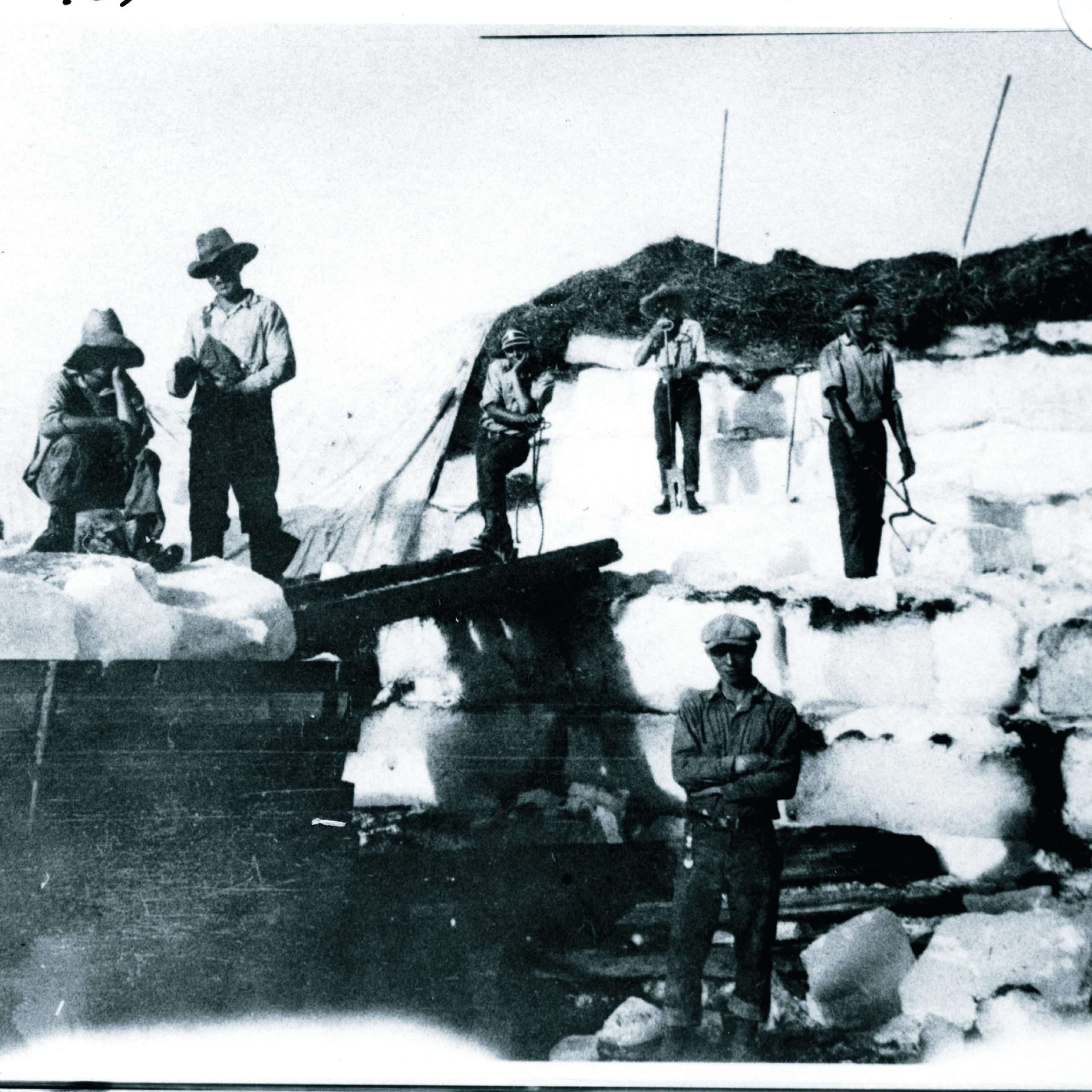 Ice harvesting bumped up the local economy and offered off-season jobs. In a 1973 interview conducted by Idaho historian Harold Forbush, then-81-yearold Jesse Edlefsen explained how it was done. “They would go in there with a saw and they would saw strips so wide and they would crosscut it and make it so long, you see, and then they would saw down about six inches and then you could break the rest very easy, break it off with what they called an ice spogeror, a bar that was tapered just right to go right down in there and break that ice off and it was run into a chute, an ice chute, and then run up into the building and as we got higher kept raising up on the chute.