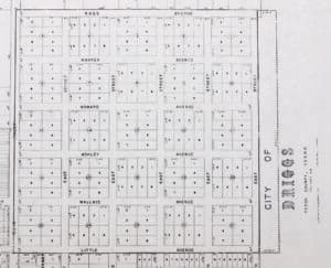 the town of Driggs 160 acres from their desert-land entry, the southeast quarter of section twenty-six. An updated surveymap from 1901 displays twenty-five blocks and all streets named: Main through Fifth streets running north and south and Ross through Little avenues running east and west. The four avenues in the middle read Harper, Howard, Ashley, and Wallace.