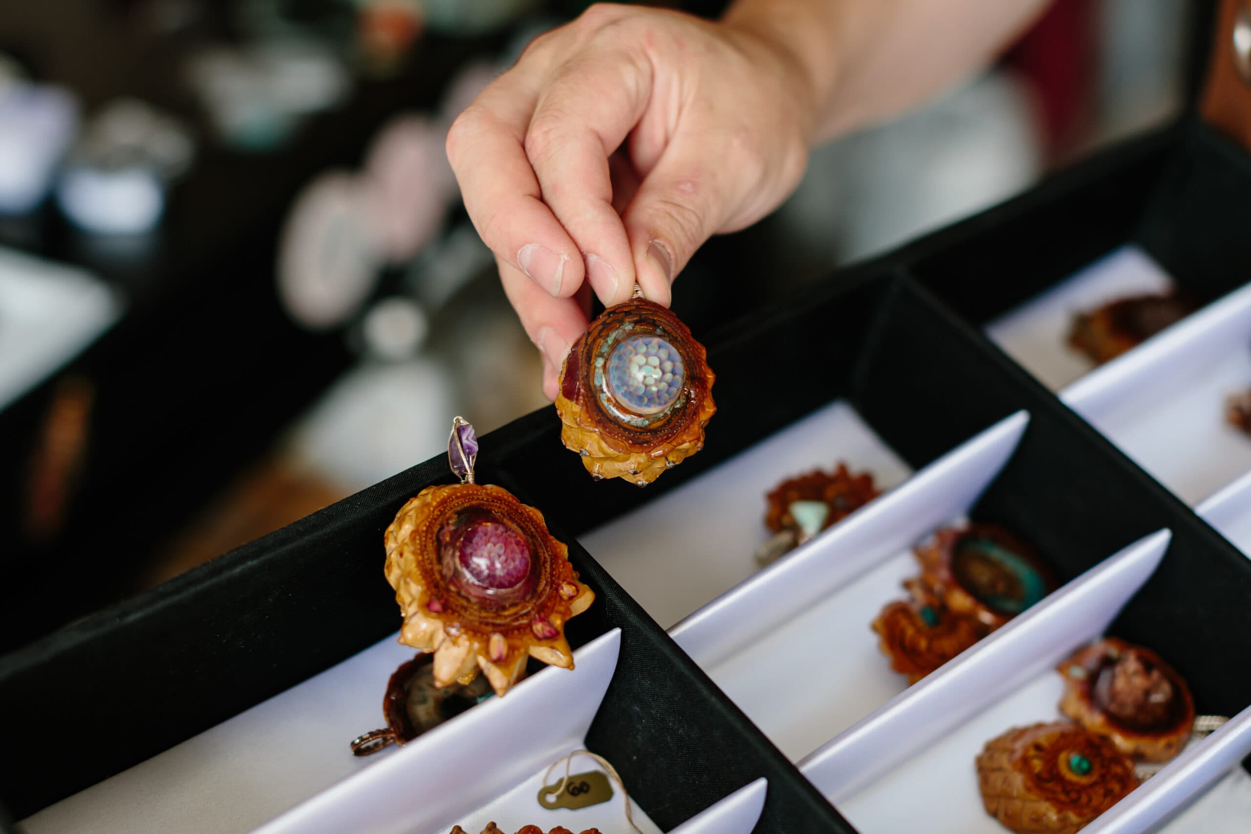 A rockhound and artist, he transforms his foraged finds into intricate pendants made from pine cone slabs embedded with stones, as well as wire-wrapped jewelry with rocks and crystals and silversmithing.