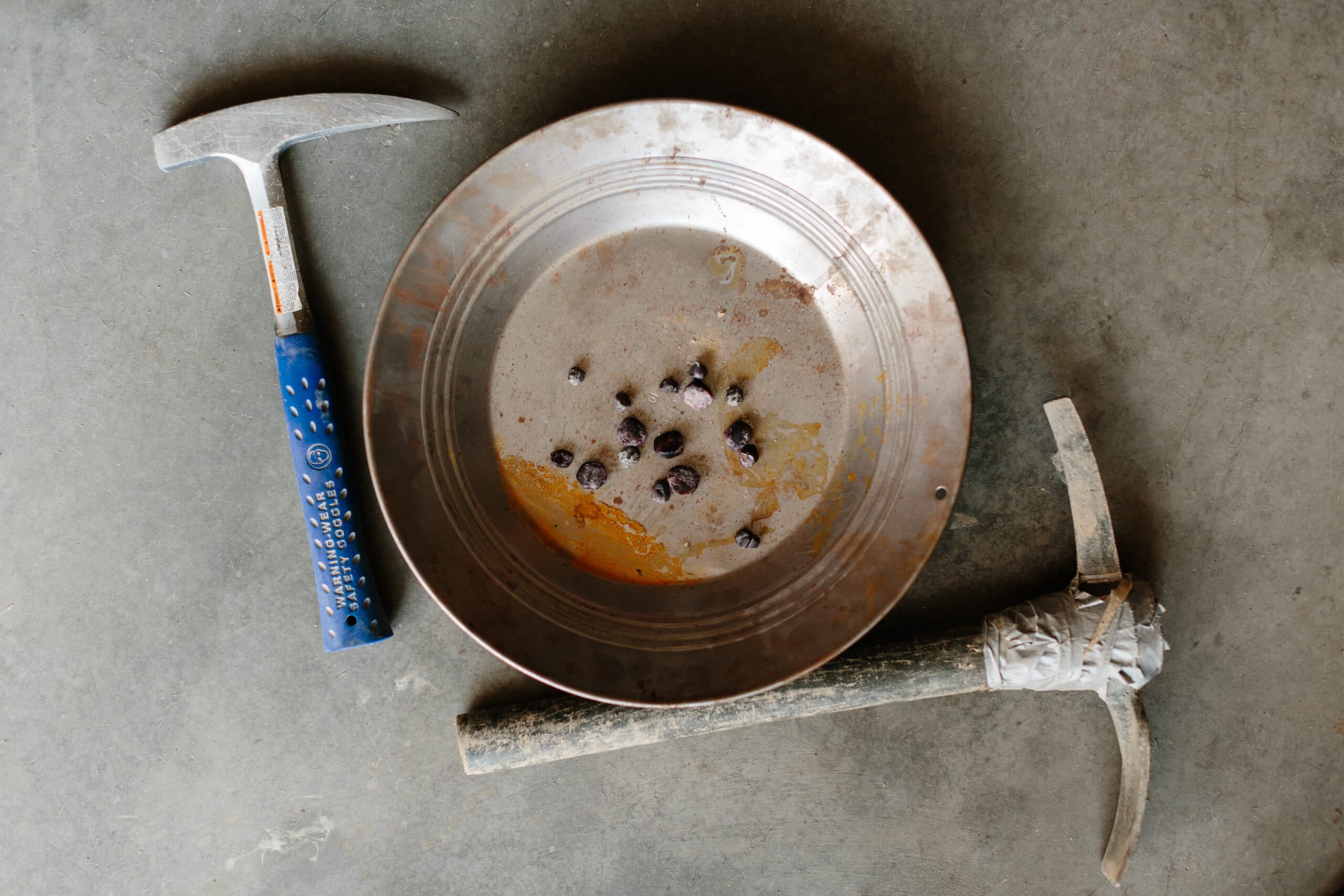 When he’s out in the field, Nick will bring a few tools, usually a shovel, rock pick, and sifter, as well as a container to carry out any finds. He often hikes miles to reach his quarries, so he packs fairly lightly. Bringing water is also key, since identifying wet rocks is much easier. “If it’s dry, it just looks like dirt,” Nick says.