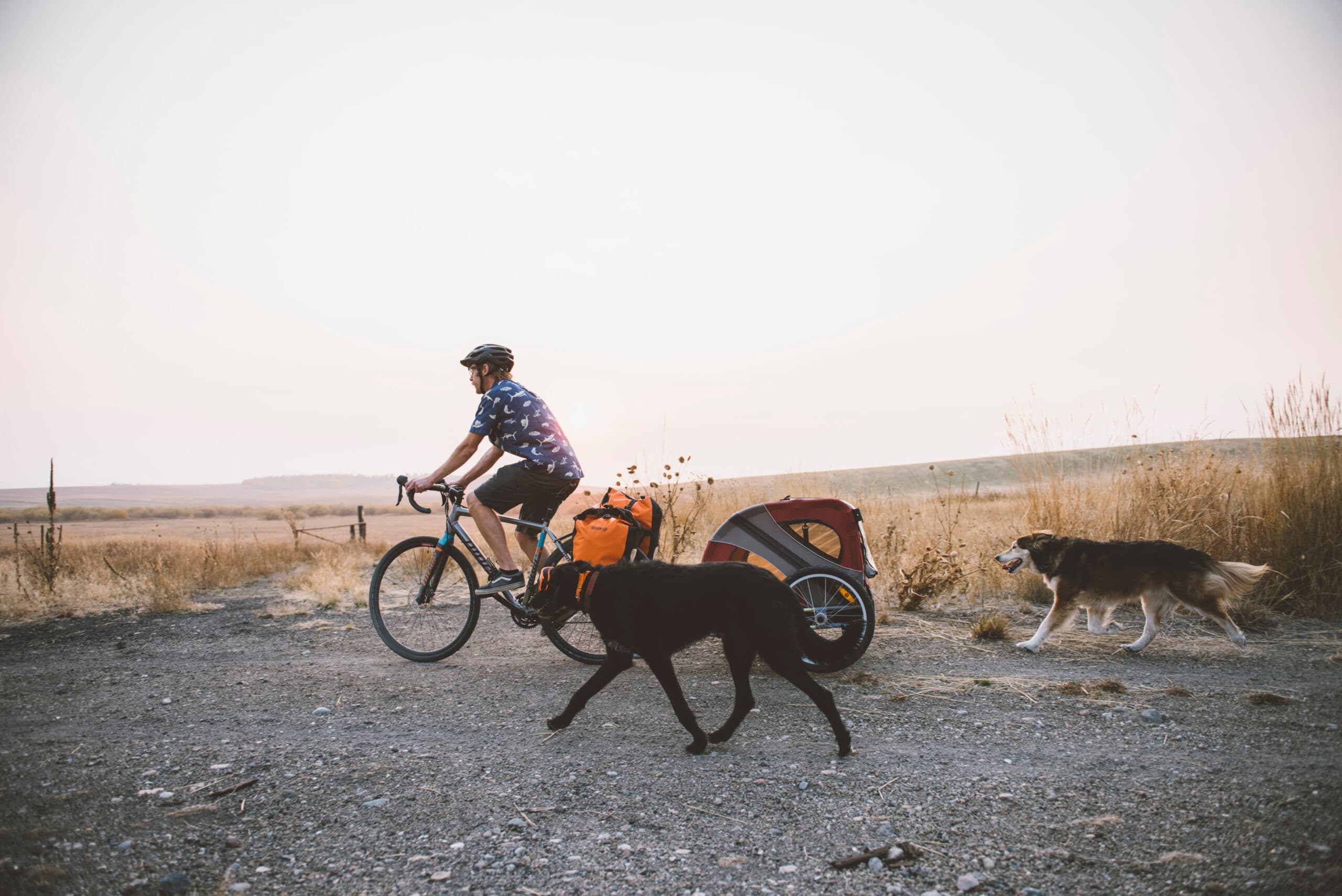 Several companies make pet-specific bike trailers. The two we purchased from the trailer company Pet Safe even have little windows on the tops for the dogs to stick their heads out of. Coupled with a rear bike rack and panniers, the setup supports an entire weekend bikepacking trip, something that has always been out of our reach unless we found someone to watch the pups. But, really, who wants to leave their dogs at home when they go camping?