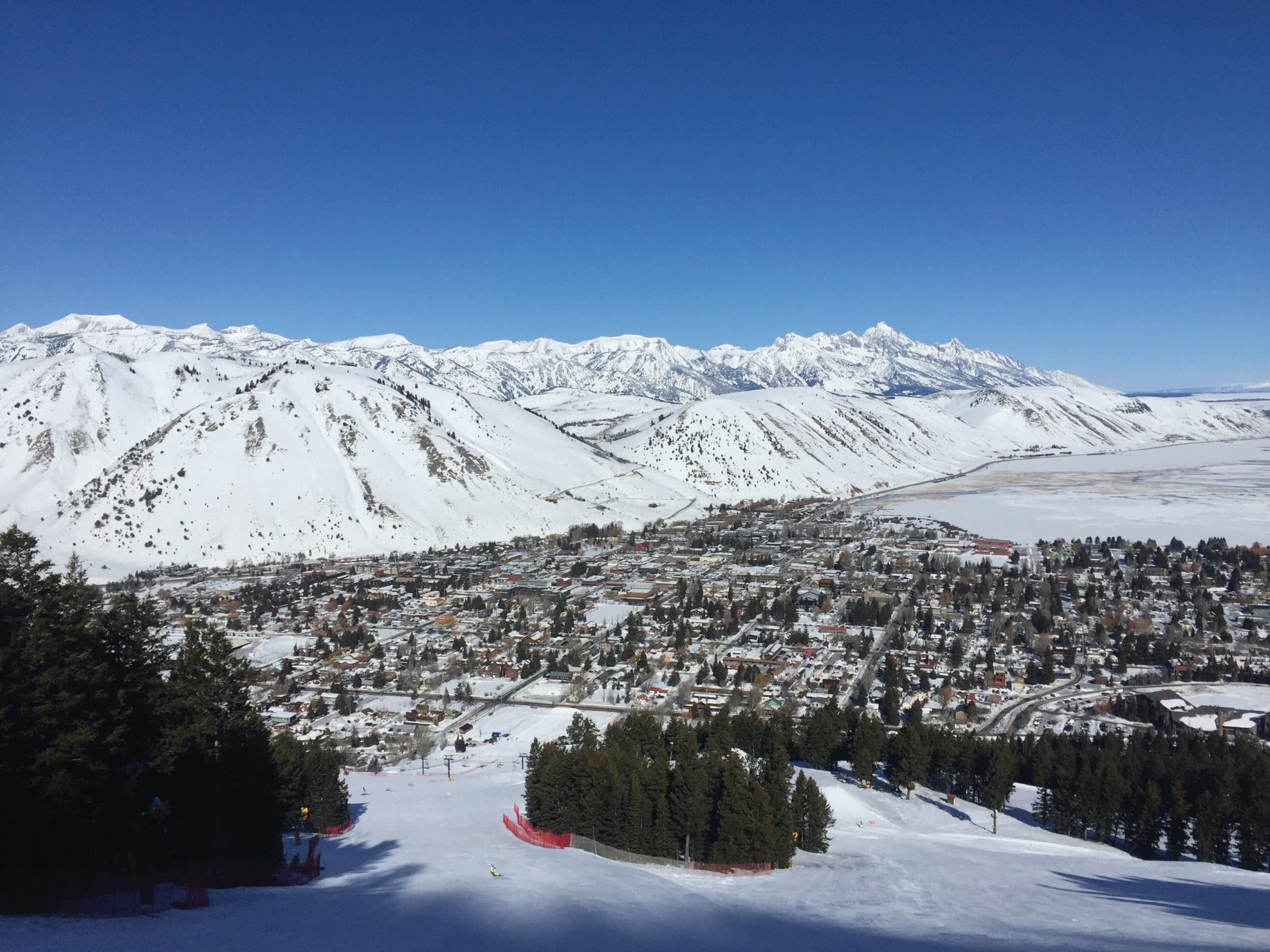 looking down on the town of Jackson Wyoming in the winter with a snow covered view
