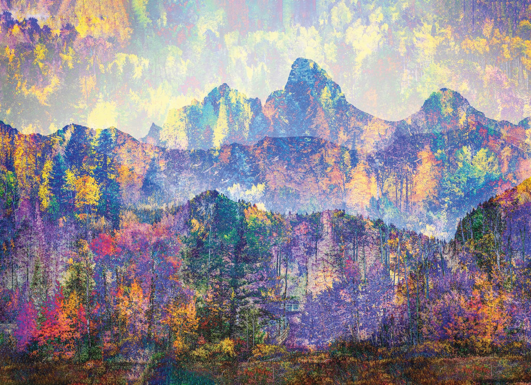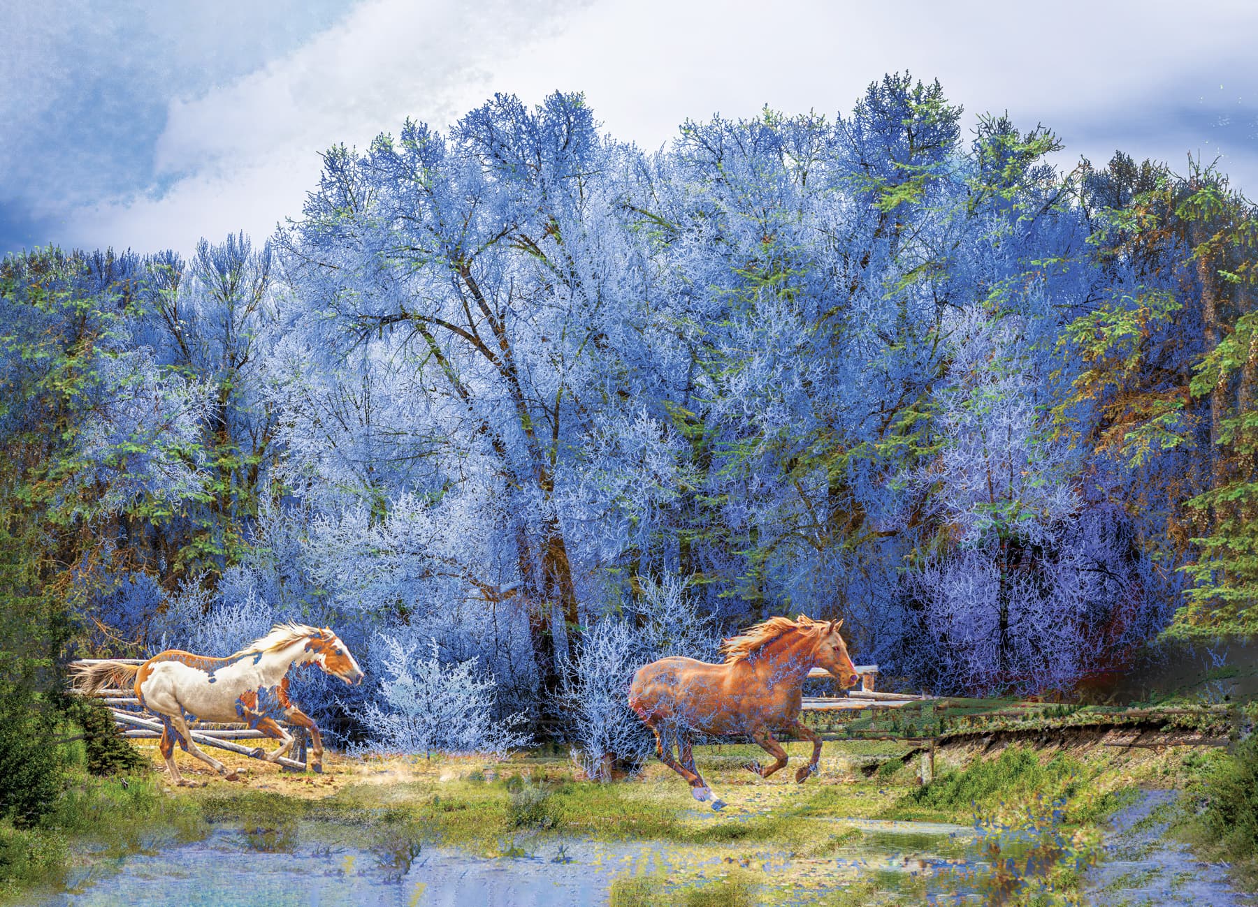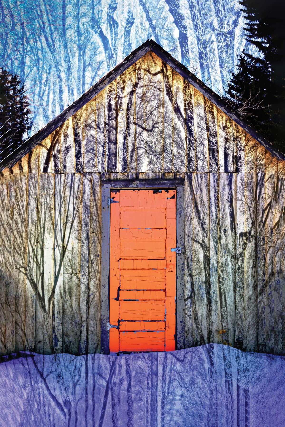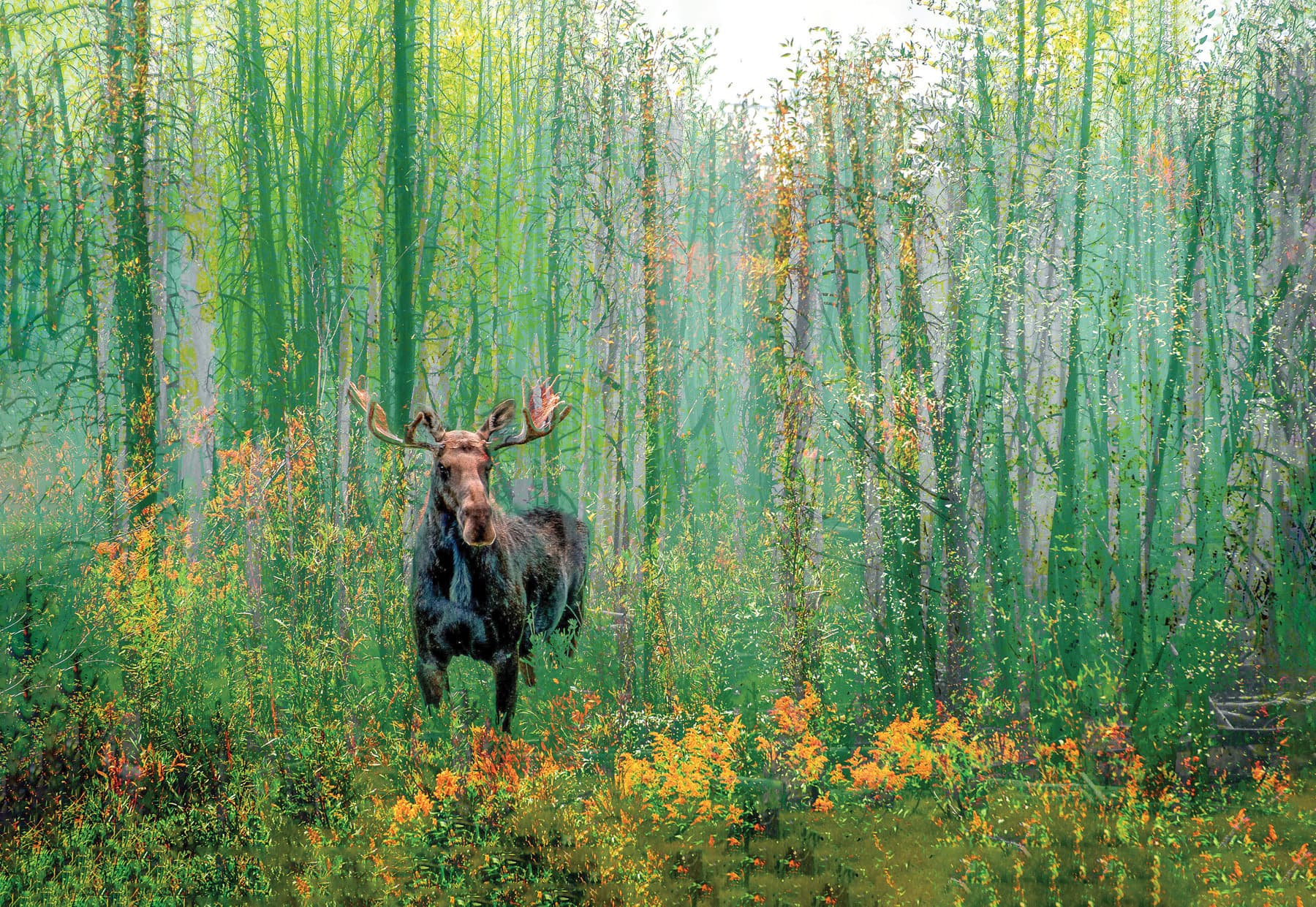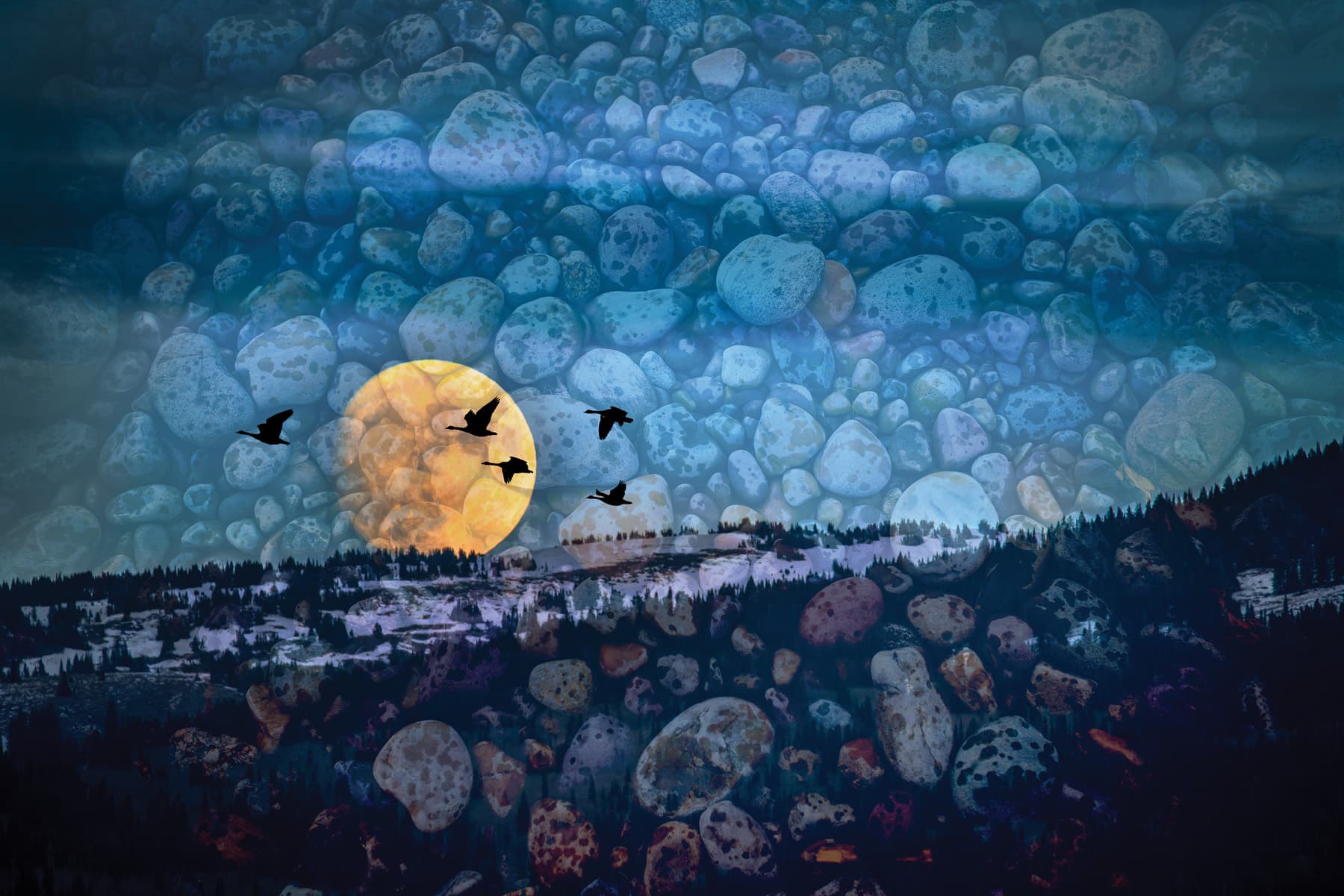 Linda devotes hours to her distinctive fine-art technique. Each incorporates at least three photographs, using what she calls “pixel magic” to create digital art. Elements of nature shine, and her love of texture is evident. One piece incorporated horses galloping amidst details of chopped wood in the background obscuring a hidden stream. Another features sandhill cranes soaring in front of a full moon in a snowy scene dotted with river rocks. The interwoven images create something new, nonpareil, and visually captivating.