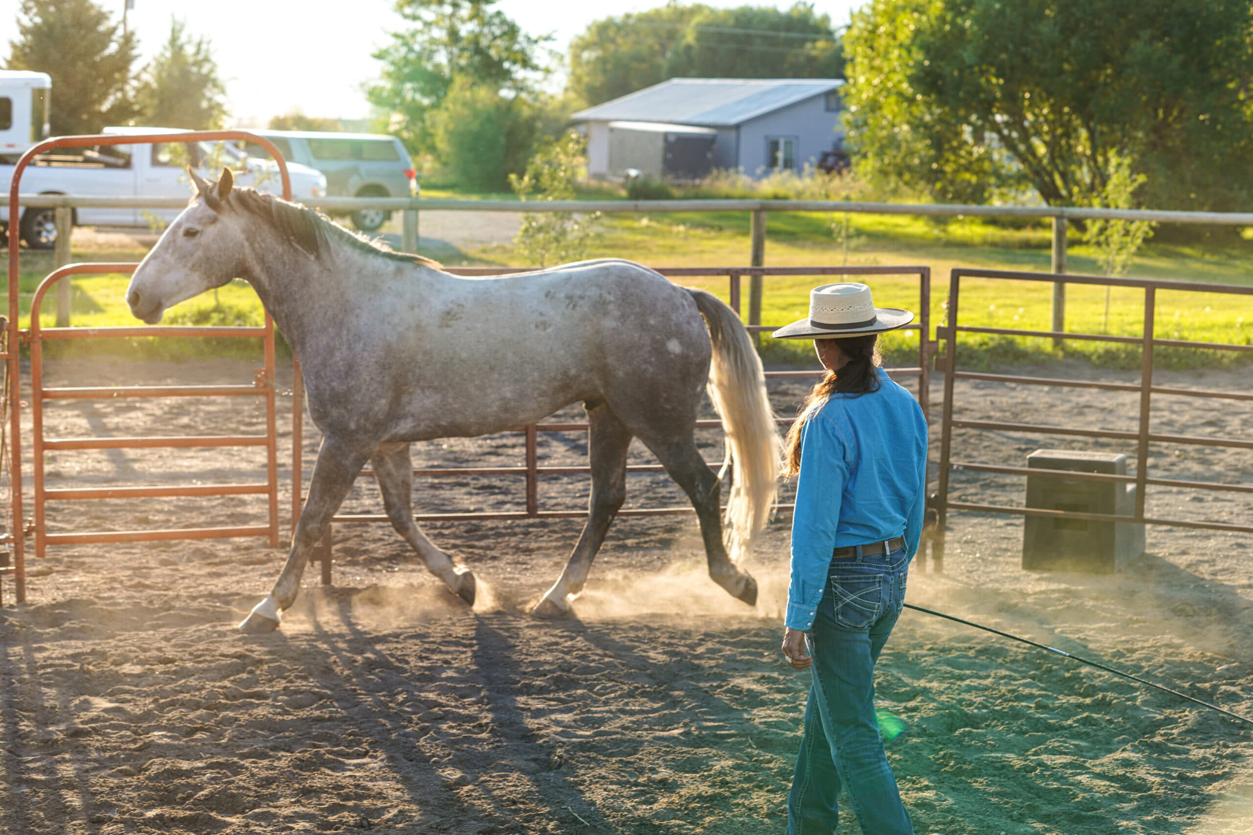 From that one brief experience, Brenda hit a serious confidence wall. She kept trying to work with Ollie, but acknowledged that she was terrified. Starting back with ground work, she thought they’d move past it. But what she was asking of Ollie was being lost in translation between human and the wild horse. “If you can’t help him translate, it’s like pulling against a current,” she says.