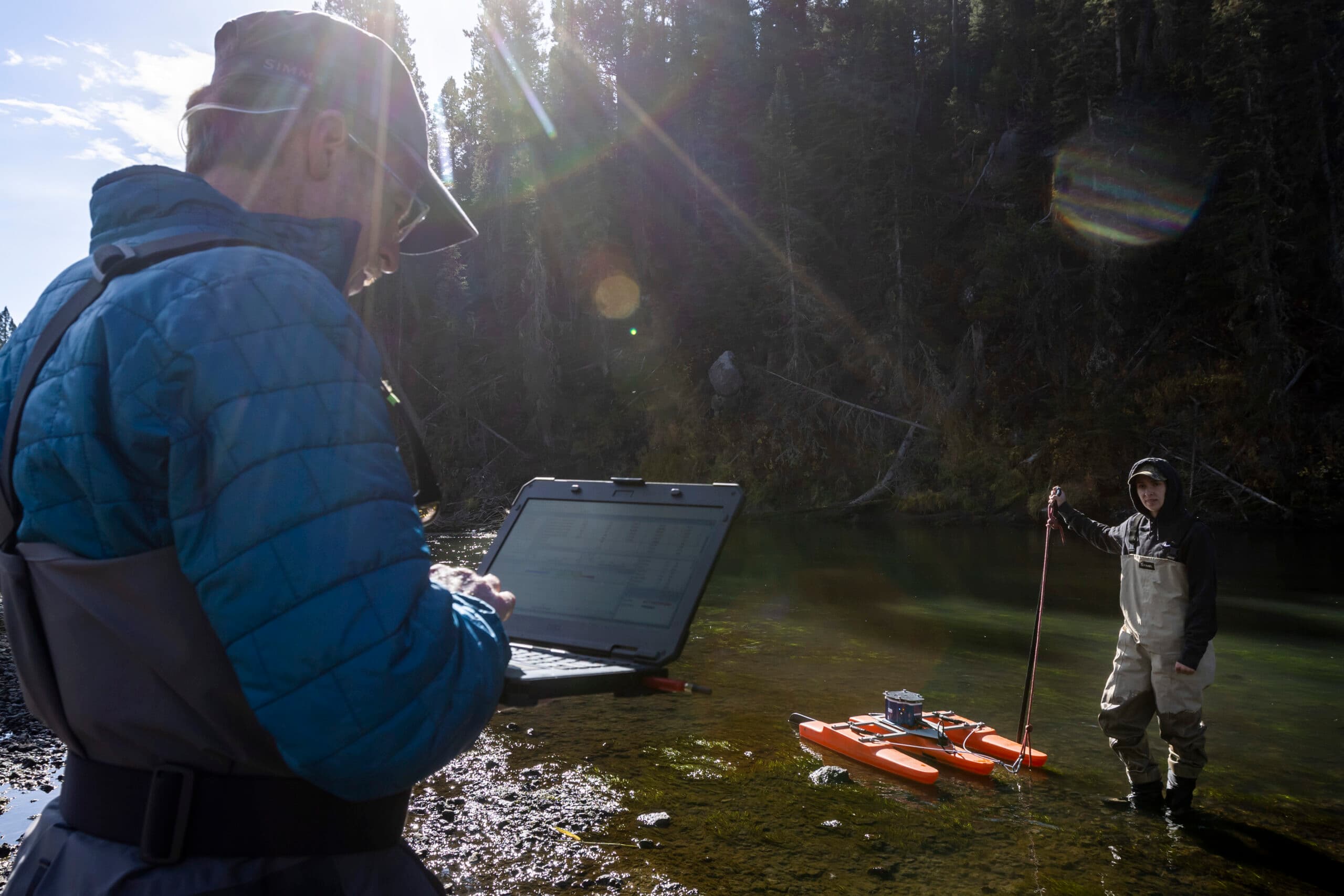 Just upstream of where Highway 20 crosses the Buffalo River in Island Park, Van Kirk and Amber Roseberry slogged through riparian plants to reach the bank. Van Kirk knelt, water seeping up through the soil as his knees compressed the earth. The October sun was shining, with a touch of crisp fall cold in the air. As he watched the screen of his laptop, Amber piloted an Acoustic Doppler Current Profiler across the 50 yards of water at a snail’s pace. Three minutes across, and she spun the craft around. Three minutes back.