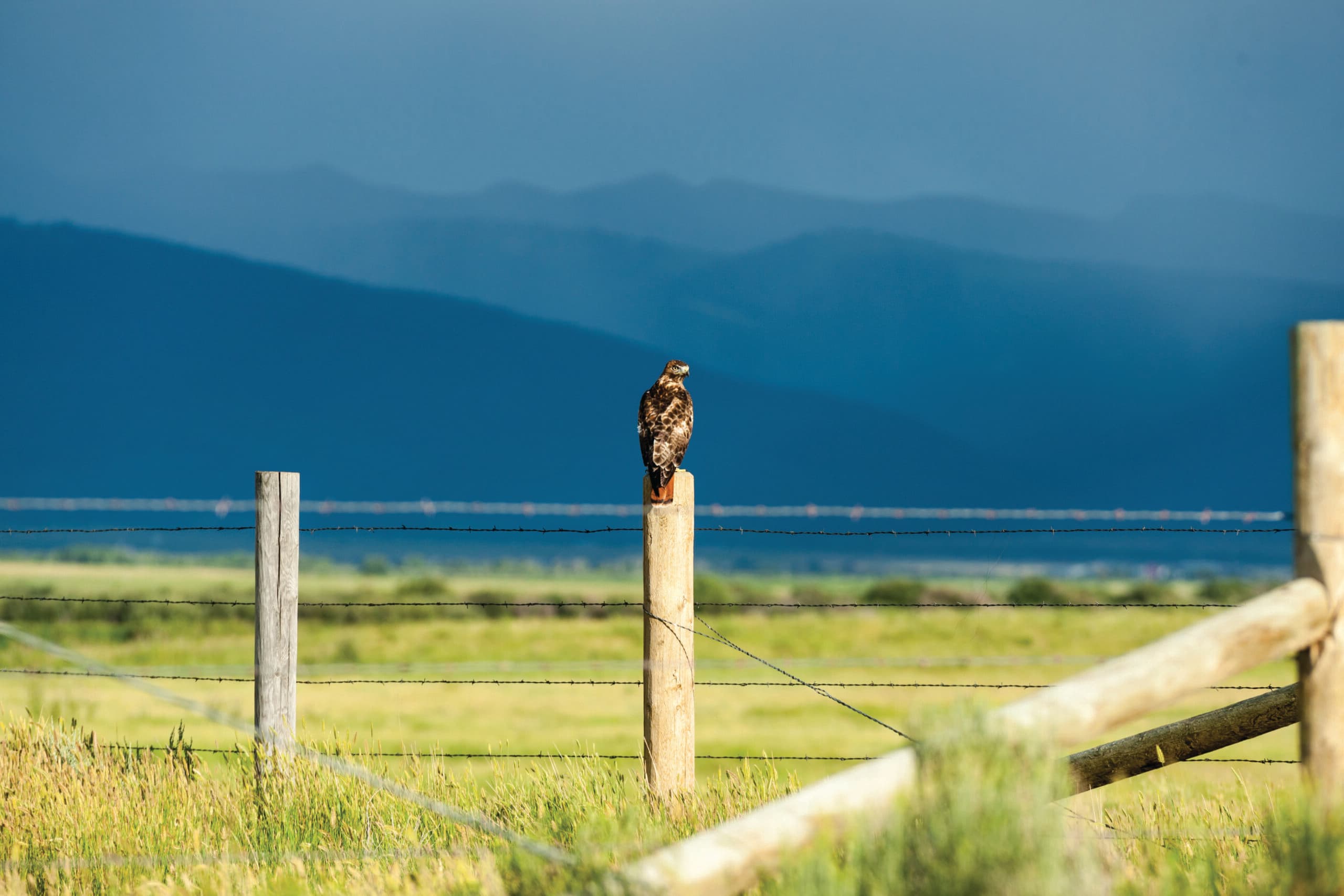“Every September when the farmers cut the grain and the sandhill cranes arrive, we get a pulse of a few ferruginous hawks,” notes Teton Valley resident Rob Cavallaro, a supervisory regional wildlife biologist with Idaho Fish and Game. “A good place to view them is in the farm fields and on the fence posts on the west side of the valley. You can see them while you’re driving the roads.” The ferruginous is the largest of the buteos, with a wingspan approaching five feet. Their upper parts are rusty brown—the name ferruginous derives from the Latin term for iron-rust colored—while their underparts are white.