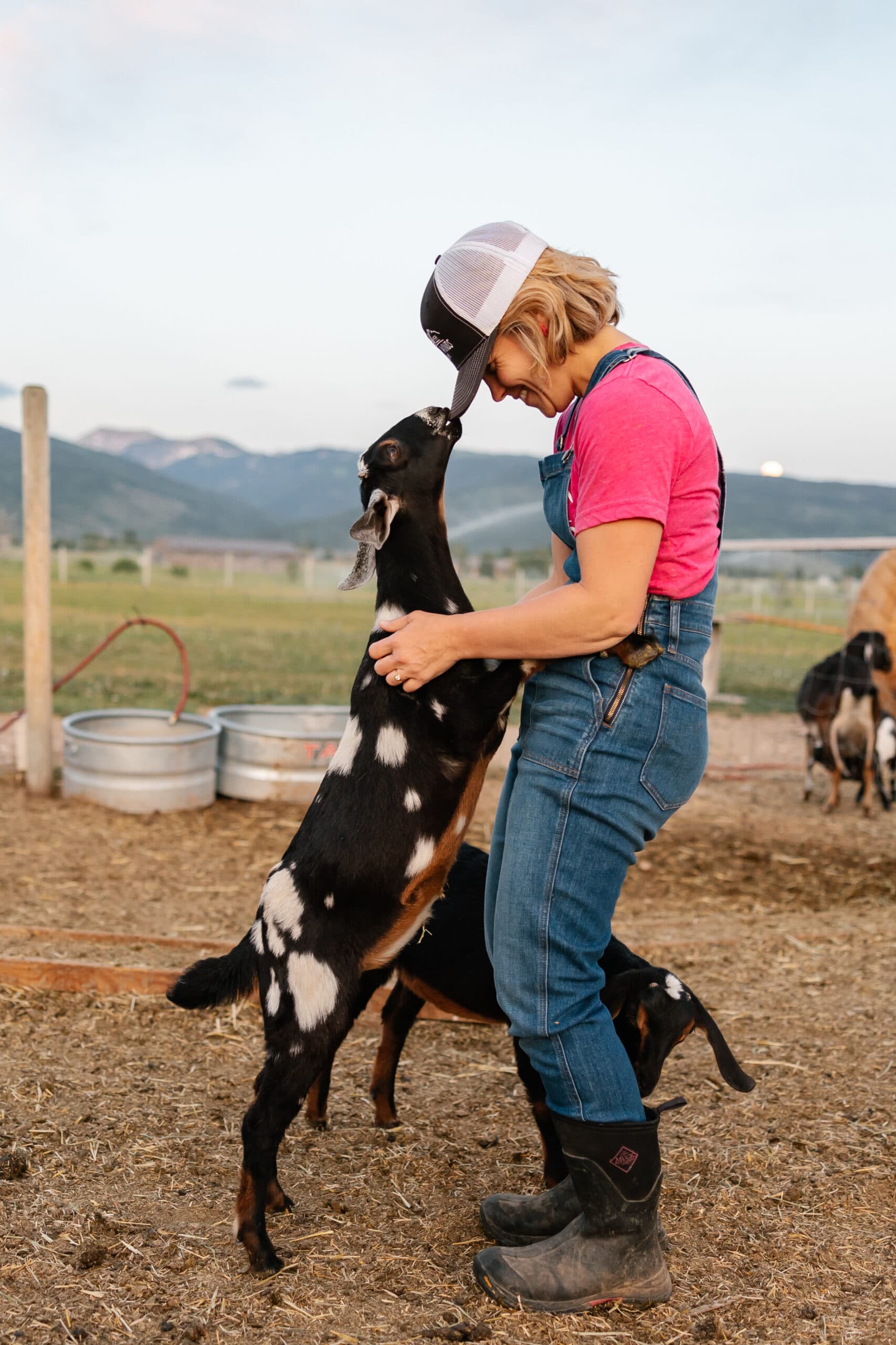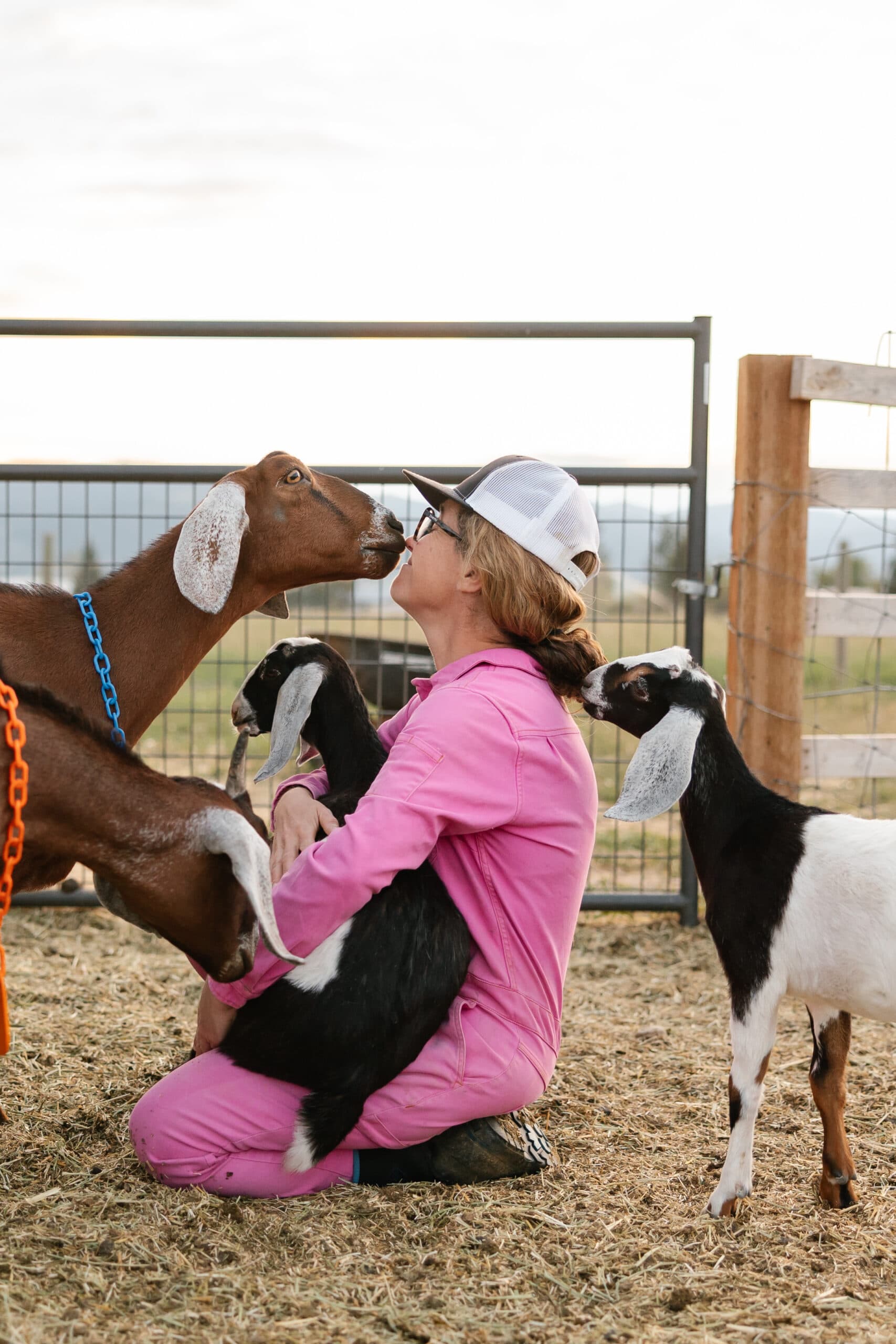 Owners Jessica Konrath and Mark Farmer introduced the snuggle sessions on their farm to help socialize spring kids to human contact and to expose Teton Valley residents to the wonderful world of goats. Encompassing twenty acres between Victor and Driggs, the farm is home to seventy-six goats, as well as to Mark, Jessica, and their dog, Blossom. Since purchasing the farm in the spring of 2020 from the original owners and developers, Nate Ray and Ginny Robbins, Jessica and Mark have taken the leap into a lifestyle centered around goats and goat-milk products.