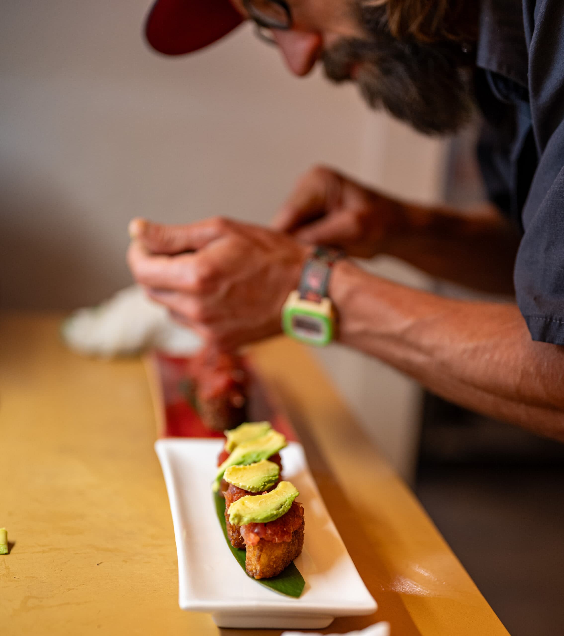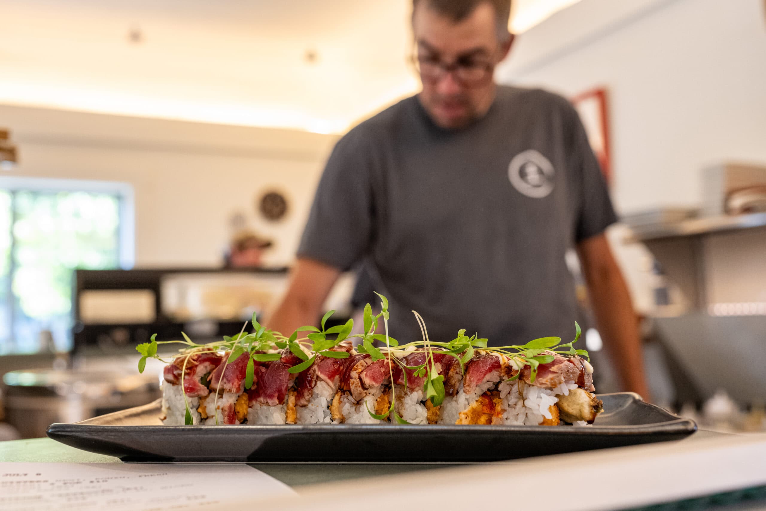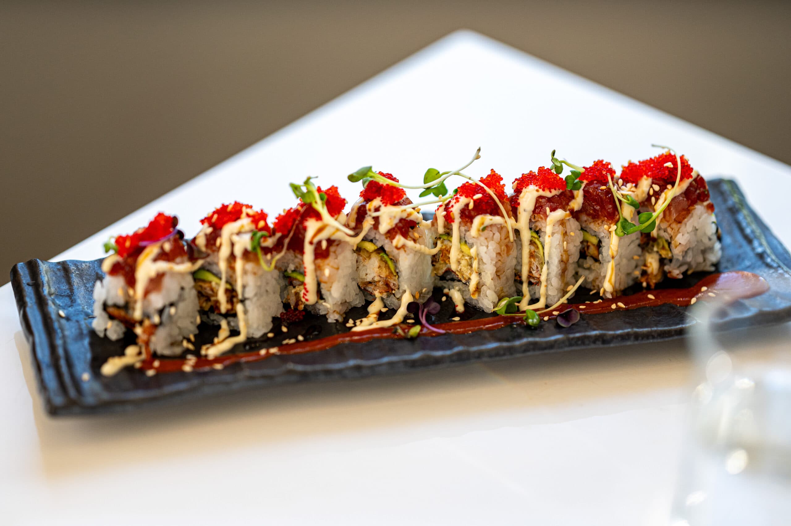 King Sushi is serving up inventive sushi, sashimi, and Japanese-inspired dishes inside its 98 East Little Avenue location in Driggs. The sushi establishment, owned by husband and wife duo, chef Jason King and Kaylan Fullerton, opened its first location in Jackson in 2014 and expanded to the west side of the Tetons in 2023. Inside the quaint white house, chic and crisp decor with warm lighting and subtle accents like carved wooden fish cascading up the wall create a cozy atmosphere. It beckons patrons to sit back, order up the unexpected, and maybe even step out of their go-to gastronomy comfort zones. For sushi aficionados and nigiri neophytes alike, the menu is stacked with Japanese-inspired flavors beyond an impressive selection of house rolls to satisfy the palate, like scallop shooters, oysters on the half shell, pork belly ramen, pork buns, and more.
