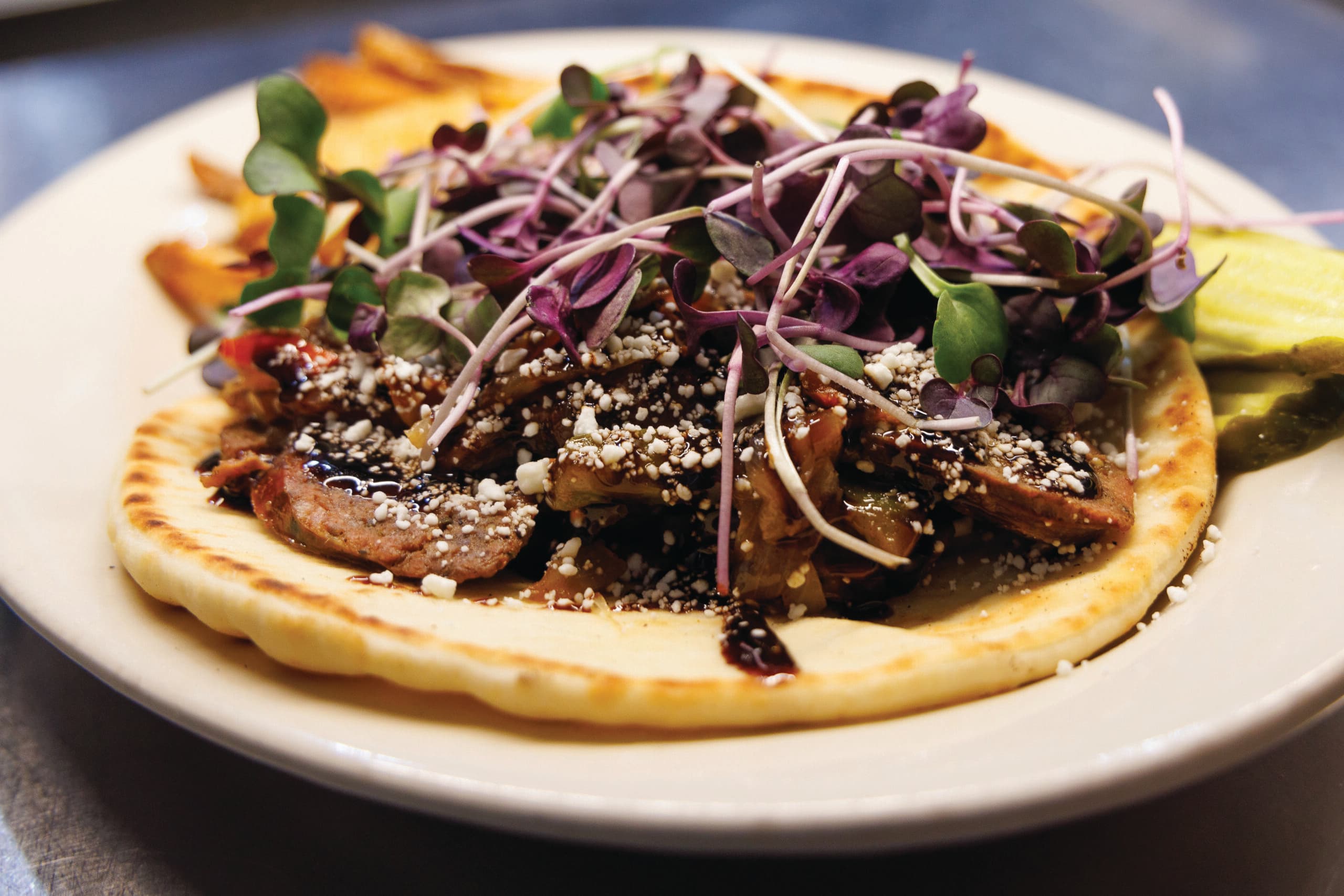 A plate heaped high with ravioli steaming under melted cheese does wonders after a day enjoyed outdoors. Another savvy selection from the Wolf’s menu is a tasty beauty known simply as the Porcini Pork Sausage Pita. This dish packs a one-two ‘local’ punch as the sausage is made just around the corner at Driggs’ very own Teton Valley Meats.
