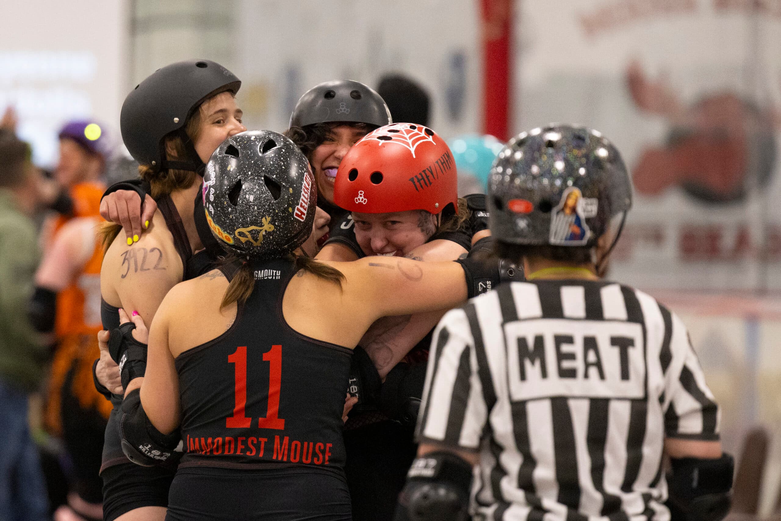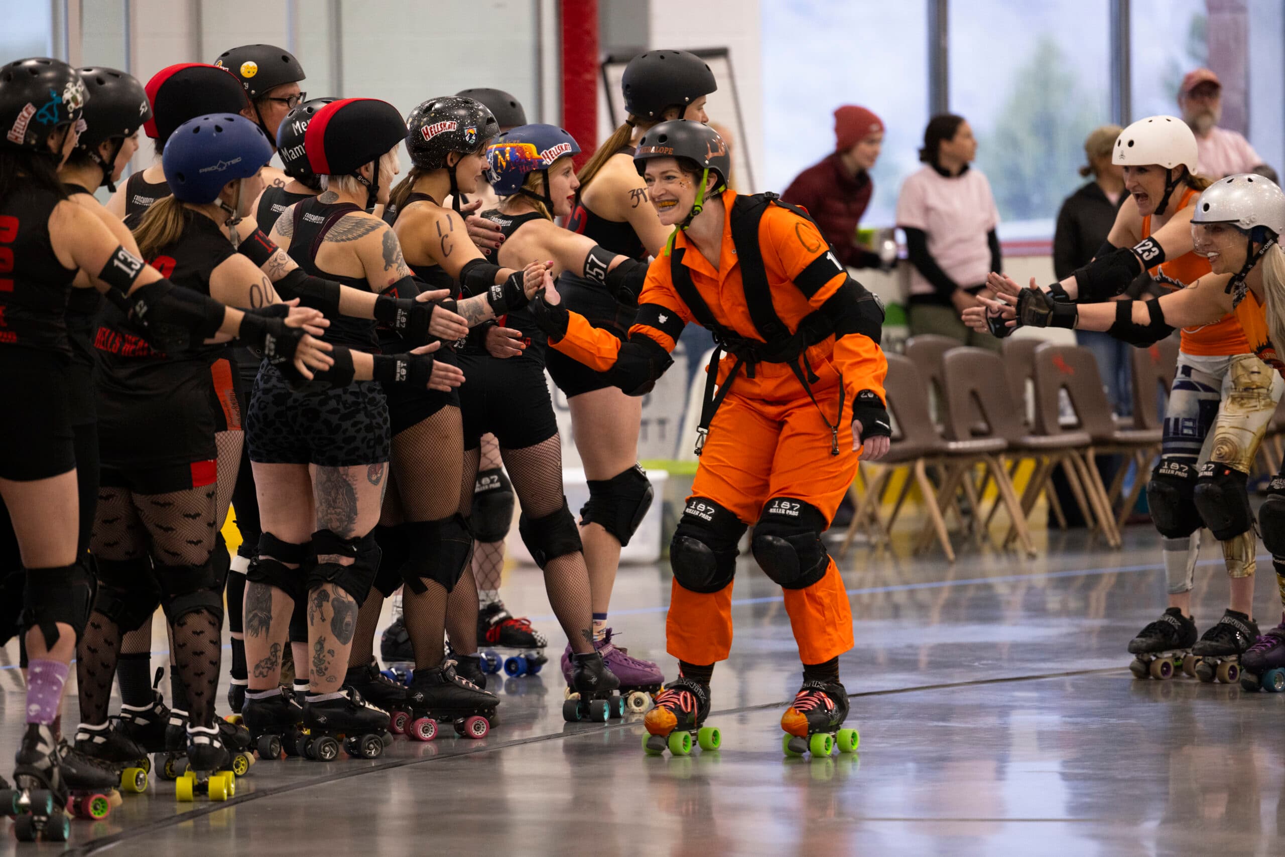 At the end of the two half-hour periods of up to two-minute jams, the Juggs have suffered a big loss to the Portneuf Valley Bruisers. But the skaters are laughing and jubilant, congratulating their opponents. Despite losing, are they still having fun? “Always,” declares Sharkpit.