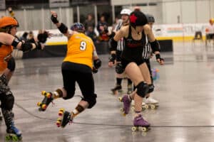 The self-named players Immodest Mouse, Hell’s Healer, and Damage Patch Kid quickly form a triad to prevent the opposing team’s jammer from busting through and scoring. Jammer Mis-Demeanor plows through opposition blockers and scores multiple points. On both sides, shoves, slams, and tumbles ensue, as the high-energy skaters attempt to score for their team, and at the same time prevent the visiting team from getting points. In a blink, the lead jammer pounds at her hips to signal the end of the jam. With smiles and determination all around, amped skaters regroup to go at another jam.